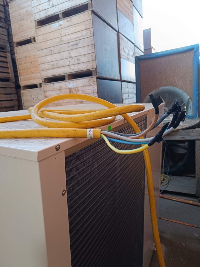 Meine Aufgabe war ein neuer Verteiler und entsprechende Stromzuleitung für die Steuerung und Versorgung des Kühlanlage. Aufgrund der relativ langen Zuleitung und der Stromaufnahme des Kühlaggregats fiel die Wahl auf eine 5×16 mm² Baustellenleitung. Trotz der hohen Flexibilität der Leitung war ein ein ordentlicher Spaß diese in knapp 7m Höhe in die Kabeltrasse zu verfrachten.