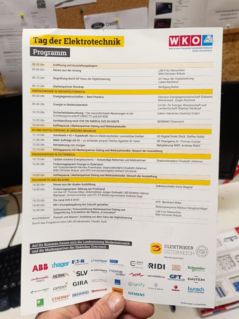 Eine Veranstaltung der Elektriker Innung Niederösterreich. Zugegeben … die Beschreibung des Events hört sich zunächst trocken an „Landesinnung Niederösterreich … Poduimsdiskussionen … diverse Größen der Politik und Wirtschaft“, das Ganze garniert mit ein paar Ausstellern der „Elektriker Österreich Marktpartner“ und es dauert von 8:30 bis 17:00 Uhr. Mein Gedanke war – in deinem ersten Jahr schaust es dir mal an, aber es fix langweilig.
